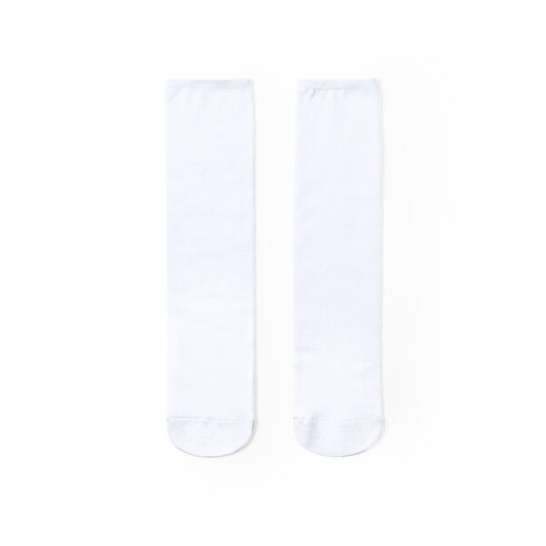 Par de calcetines fabricados en poliéster blanco y especialmente diseñados para marcaje en sublimación. En talla S-M.