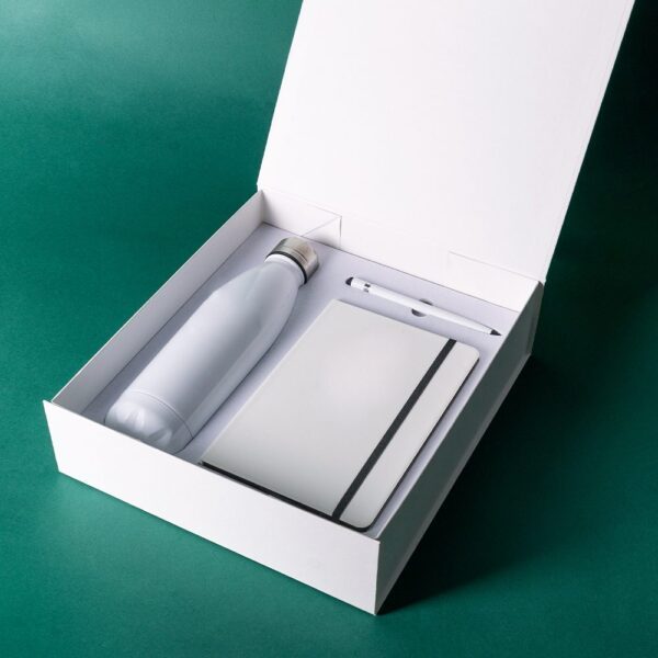 Conjunto de libreta fabricada en PU,botella con acabado especial apto para sublimacion y lápiz infinito fabricado en aluminio reciclado presentado en caja de cartón kraft con cierre magnetico. Si lo personalizas, el kit está preparado.