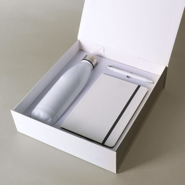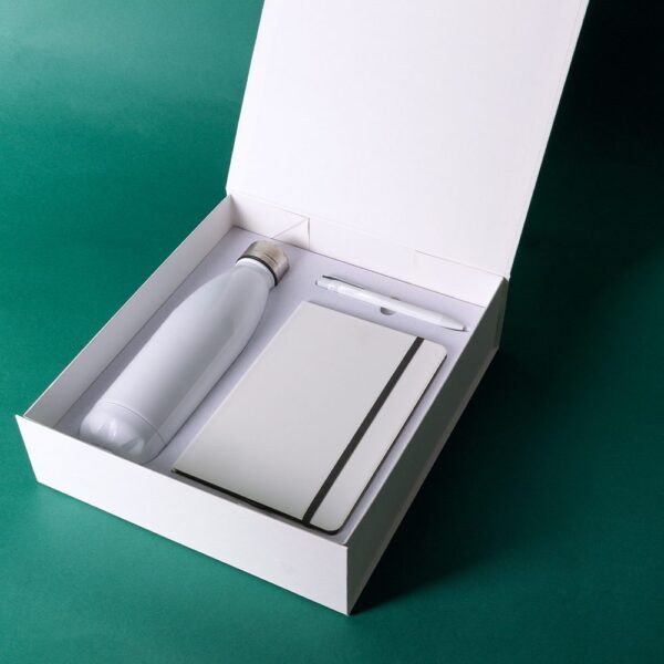 Conjunto de libreta fabricada en PU,botella con acabado especial apto para sublimacion y bolígrafo fabricado en aluminio reciclado presentado en caja de cartón kraft con cierre magnetico. Si lo personalizas, el kit está preparado.