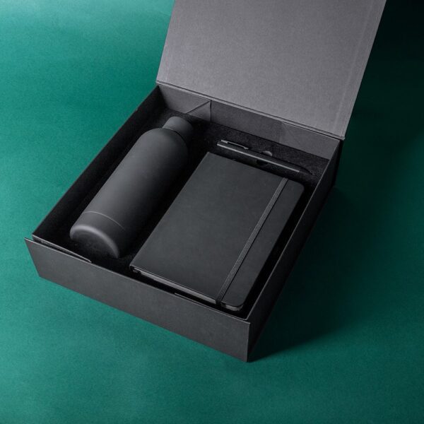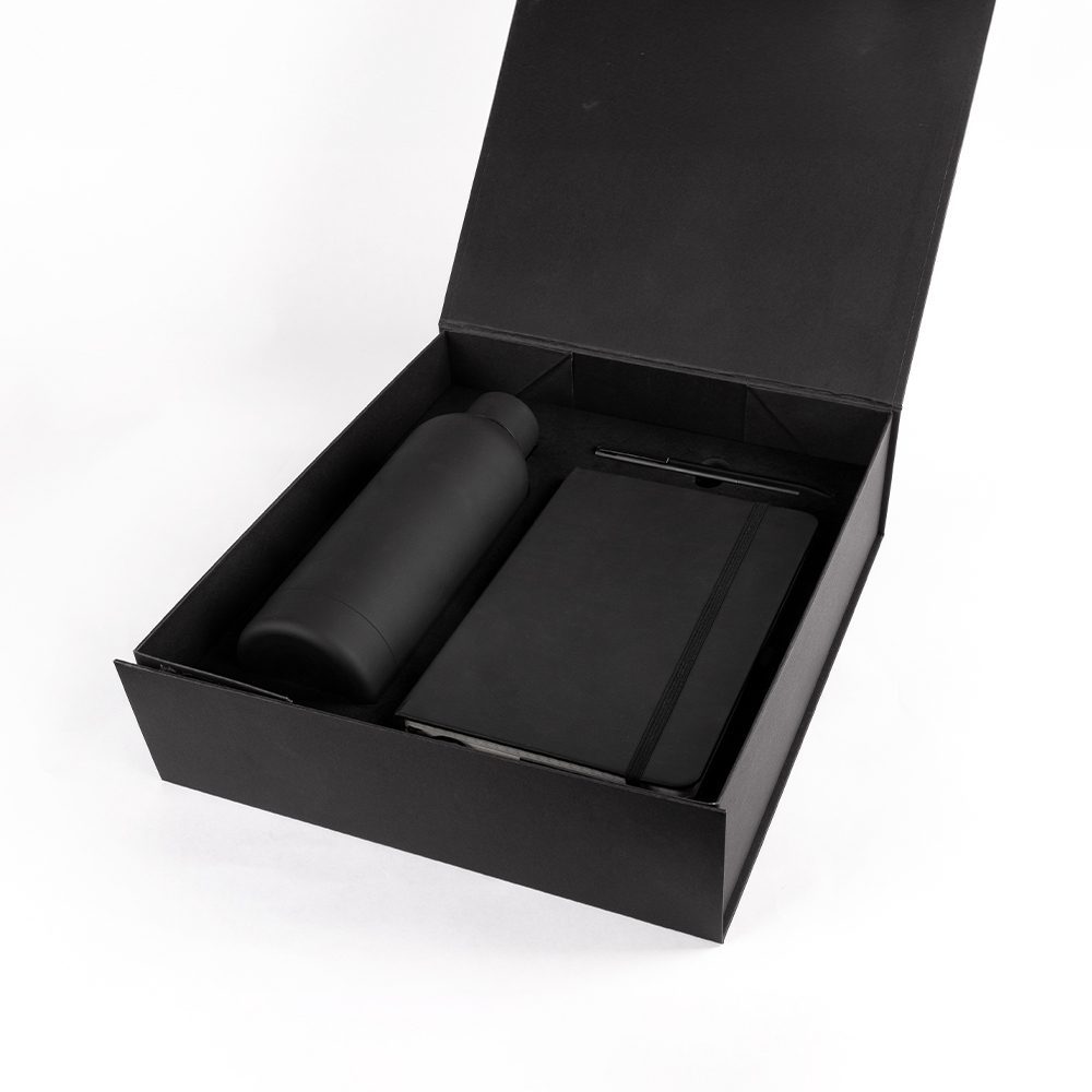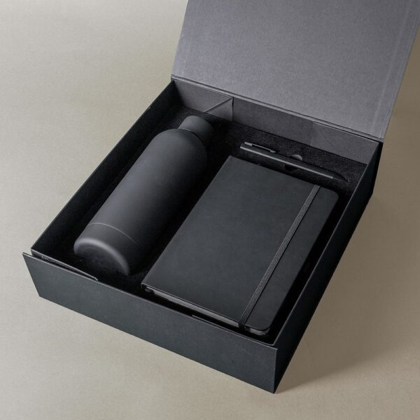 Conjunto de libreta fabricada en PU,botella de acero inoxidable reciclado y bolígrafo fabricado en acero inoxidable de gran calida presentado en caja de cartón kraft con cierre magnetico.